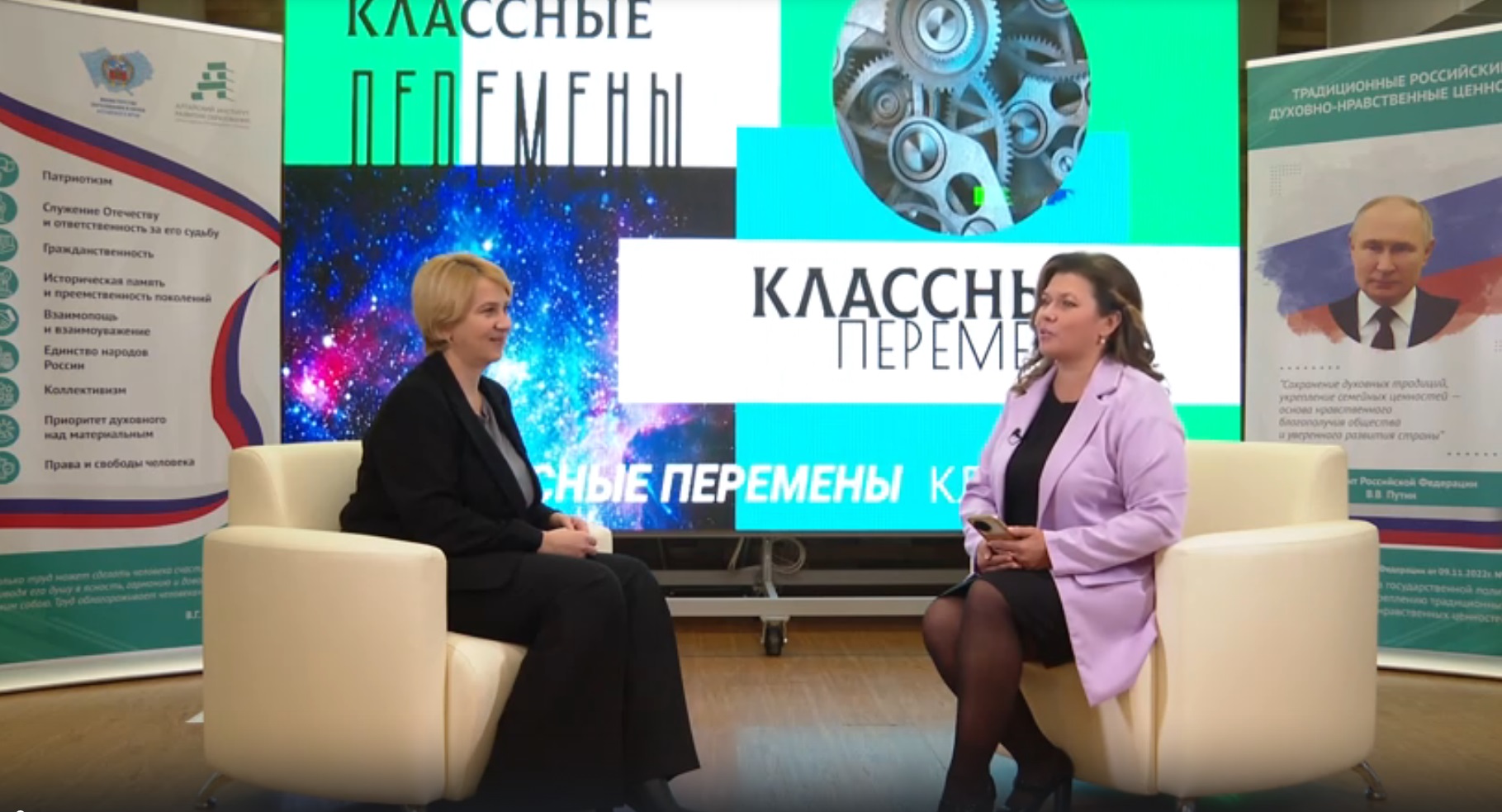 Министерством ведется постоянная работа по отбору кандидатов для участия в телевизионном проекте «Классные перемены», транслируемом телеканалом «Катунь 24». В 2024 году в проекте принимали участие победители региональных и федеральных конкурсов профессионального мастерства, успешные молодые педагоги, педагоги-новаторы. Все интервью с гостями студии дополнены тематическими видеосюжетами. В отборочном этапе федерального телевизионного проекта (конкурса) «Классная тема!» в г. Москве, проводимом Министерством просвещения Российской Федерации совместно с телеканалом «Россия 1», приняли участие 45 алтайских педагогов, в число 35 полуфиналистов федерального проекта включен учитель истории КГБОУ «Новоалтайская общеобразовательная школа-интернат» Виктория Нестерова.
